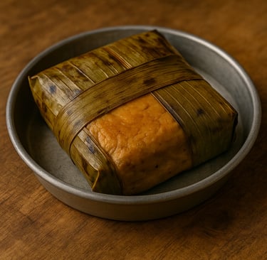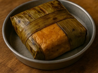 3-Extiende masa sobre hojas de plátano, coloca el relleno y cubre con más masa.